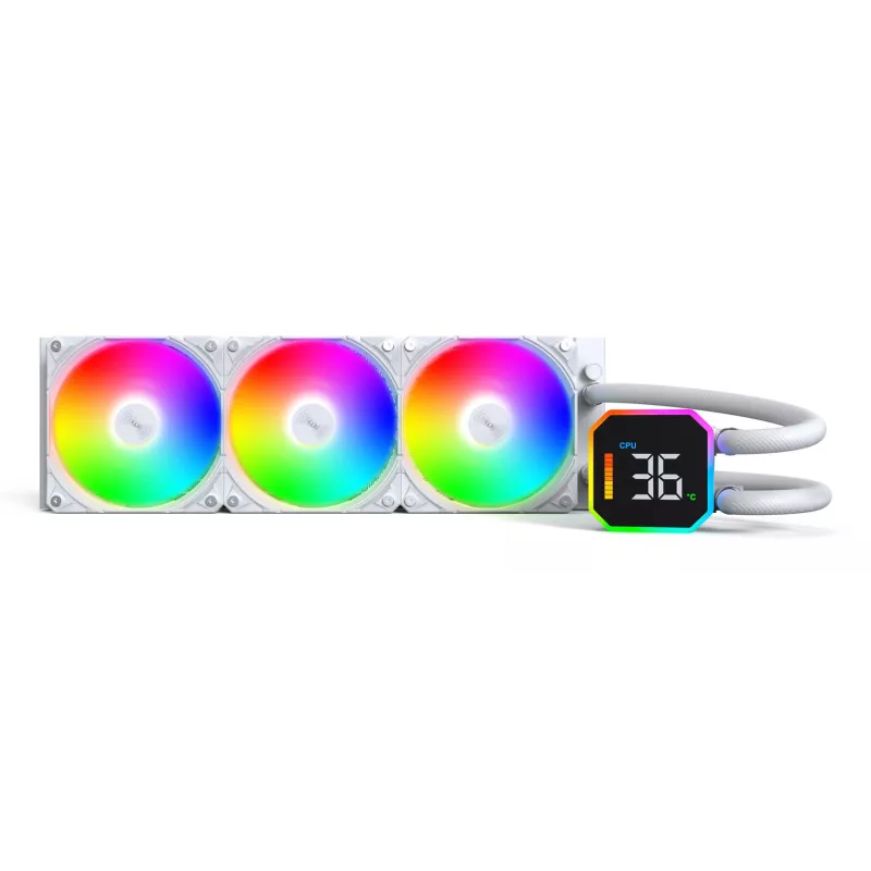Model name HyperFlow Digital 360 , 120 mm , Type All-in-one liquid cooler , Supported processor sockets LGA 1150 (Socket H3)/LGA 1151 (Socket H4)/LGA 1155 (Socket H2)/LGA 1156 (Socket H)/LGA 1200 (Socket H5)/LGA 1700/LGA 2011 (Socket R)/LGA 2066/Socket AM3/Socket AM4/Socket AM5 , Suitable location Processor , Maximum airflow 96.27 cfm , Airflow 129.5 m³/h , Pulse-width modulation (PWM) support Yes , Bearing type Fluid Dynamic Bearing (FDB) , Pump connector 4-pin , Fan speed (max) 2200 RPM , Pump motor speed 3100 RPM , Colour White , Radiator material Aluminum , Number of fans 3 fan(s) , Illumination LED Yes , Illumination colour Blue/Green/Red/Amber , LED connector type 3-pin , Fan connector 4-pin , Radiator height 120 mm
