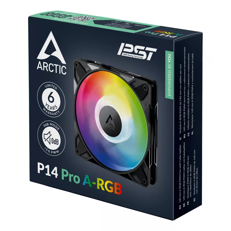 - ARCTIC P14 PRO A-RGB 140 MM A-RGB PWM FAN WITH CABLE SPLITTER. TYPE: FAN, FAN DIAMETER: 14 CM, ROTATIONAL SPEED (MIN): 400 RPM, ROTATIONAL SPEED (MAX): 2500 RPM, AIRFLOW: 186 M /H, MAXIMUM AIR PRESSURE: 5.2 MMH2O, BEARING TYPE: FLUID DYNAMIC BEARING (FDB)