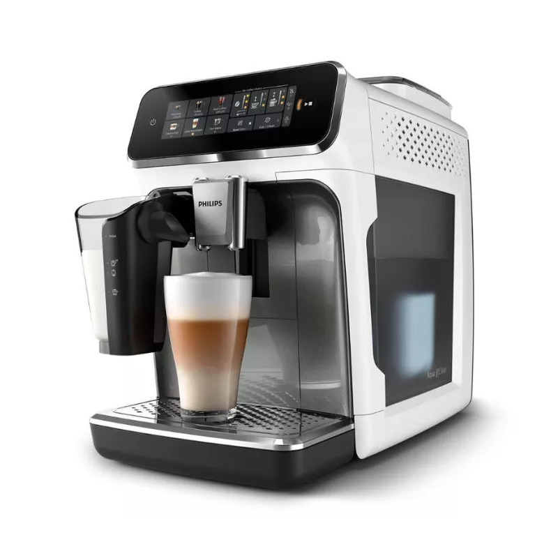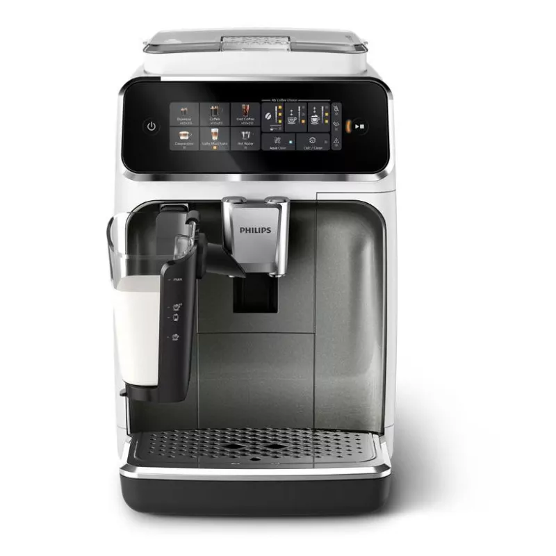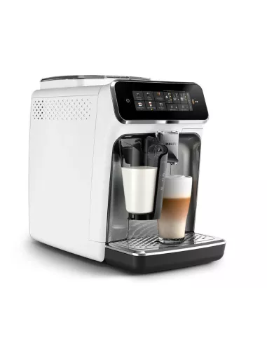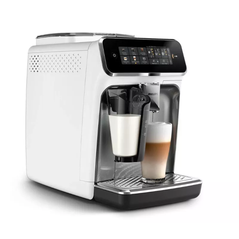 Coffee type Beans , Coffee machine features Cup volume adjustment/Double cup dispense/Cappuccino maker/Coffee grinding/Adjustable grinding/Milk frother/Automatic rinsing/Auto-power off , Water capacity 1.8L , Control type Sensory , Power consumption 1500 Watts , Colour White , Dimensions 433 x 246 x 371 mm , Product Net Weight 8 kg