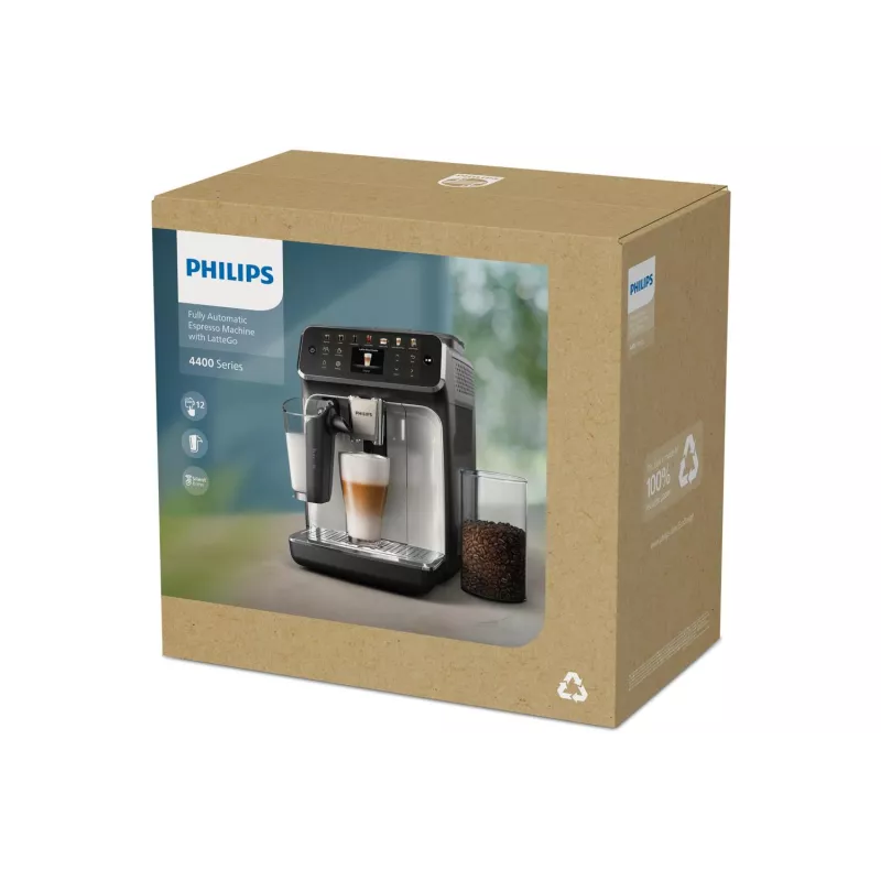 - PHILIPS EP4443/70. PRODUCT TYPE: ESPRESSO MACHINE, COFFEE MAKER TYPE: FULLY-AUTO, WATER TANK CAPACITY: 1.8 L, COFFEE INPUT TYPE: COFFEE BEANS, RESERVOIR FOR BREWED COFFEE: CUP, CAPACITY IN CUPS: 2 CUPS, NUMBER OF SPOUTS: 2, BUILT-IN GRINDER. DISPLAY TYPE: