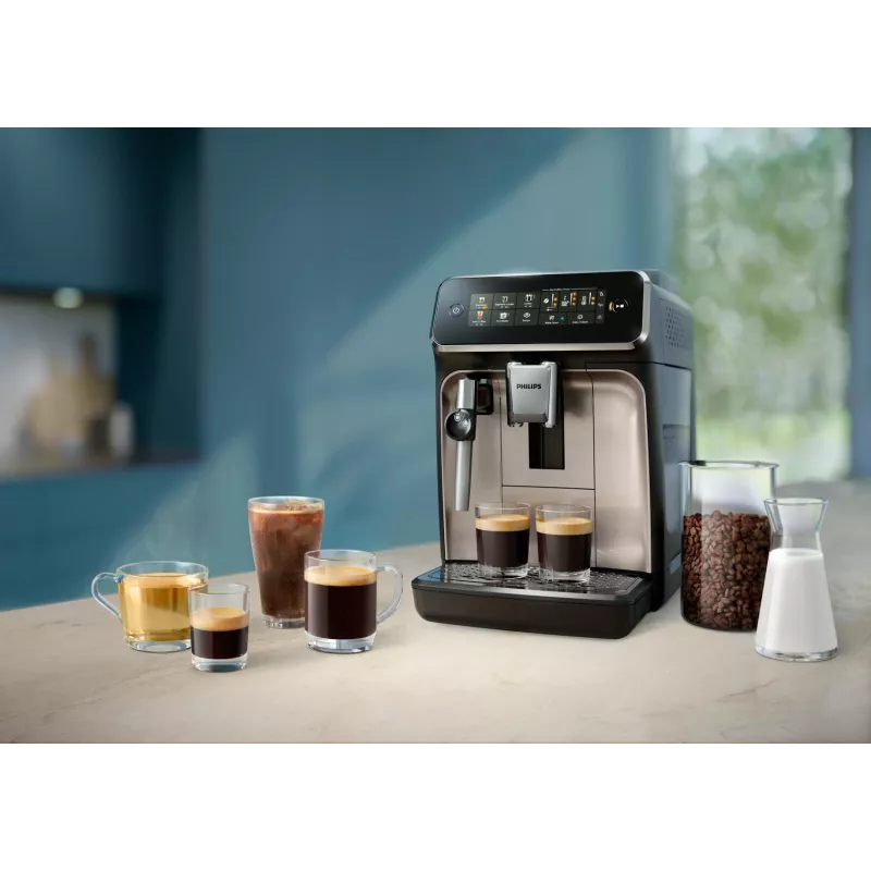 - PHILIPS EP3321/40. PRODUCT TYPE: ESPRESSO MACHINE, COFFEE MAKER TYPE: FULLY-AUTO, WATER TANK CAPACITY: 1.8 L, COFFEE INPUT TYPE: COFFEE BEANS, RESERVOIR FOR BREWED COFFEE: CUP, NUMBER OF SPOUTS: 2, BUILT-IN GRINDER. DISPLAY TYPE: TFT. POWER: 1500 W