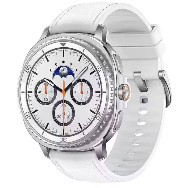 GALAXY WATCH8 , AMOLED , 3.3 cm (1.3") , Brightness 600 cd/m² , Display type Digital , Display resolution 438 x 438 pixels , Touchscreen Yes , Operating system installed Wear OS , RAM capacity 2000 MB , Flash memory 64 GB , Shape Round , Market positioning Smartwatch , Watch case size 46 mm , Watch case colour Silver , Watch case material Aluminium , Band colour White , Heart rate monitor Yes , Near Field Communication (NFC) Yes , Wi-Fi Yes , Bluetooth version 5.3 , Battery type Built-in battery , Battery capacity 445 mAh , Battery life (max) 30 h , Charging time 1.3 h , Weight 63.5 g