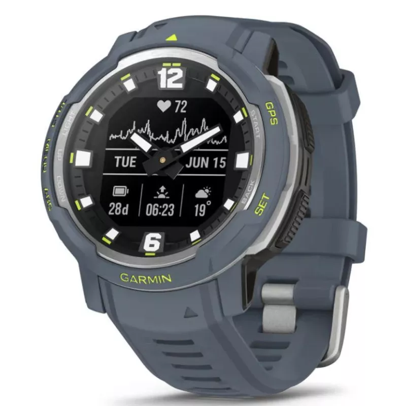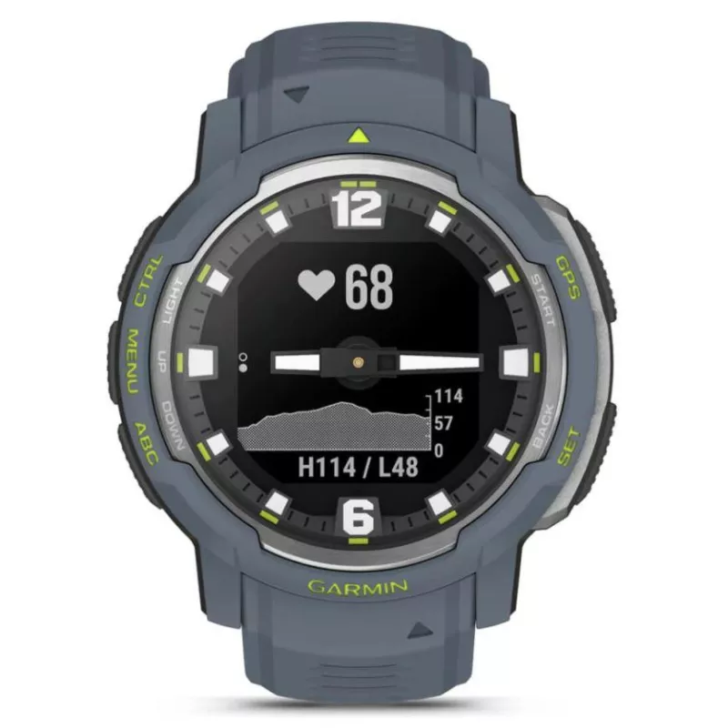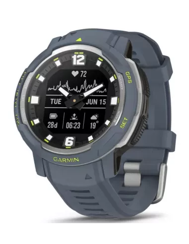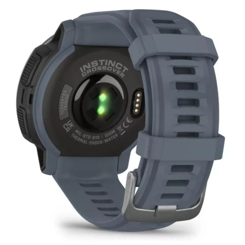 - GARMIN INSTINCT CROSSOVER - STANDARD EDITION. DISPLAY DIAGONAL: 2.29 CM (0.9"), DISPLAY TECHNOLOGY: MIP, DISPLAY RESOLUTION: 176 X 176 PIXELS. GPS (SATELLITE). WEIGHT: 65 G. WATERPROOF UP TO: 100 M, BAND MATERIAL: SILICONE, BAND COLOUR: BLUE, BAND SIZE: O