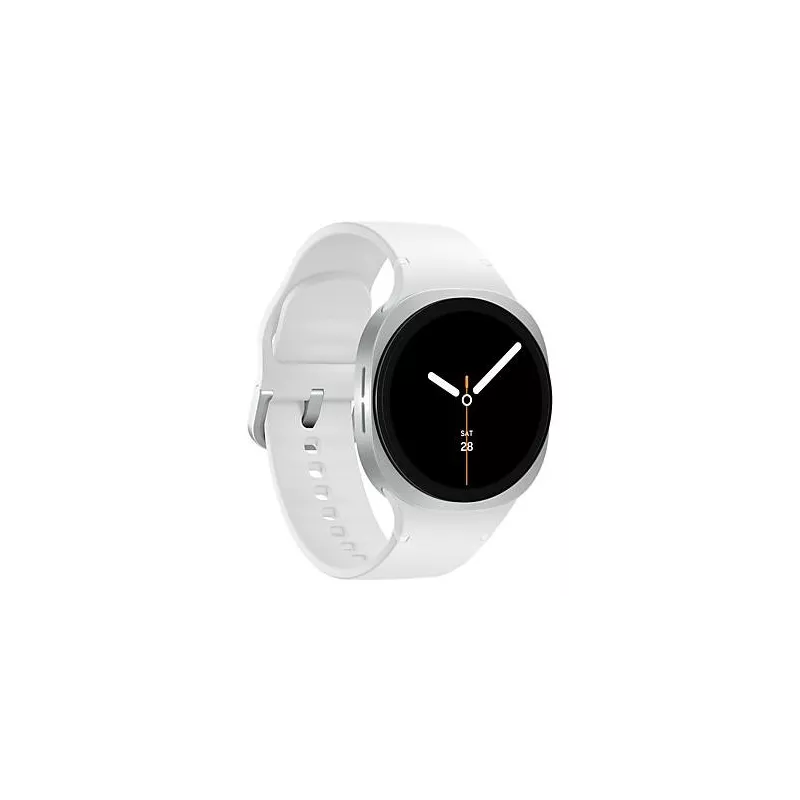 GALAXY WATCH8 , AMOLED , 3.3 cm (1.3") , Brightness 600 cd/m² , Display type Digital , Display resolution 438 x 438 pixels , Touchscreen Yes , Operating system installed Wear OS , RAM capacity 2000 MB , Flash memory 32 GB , Shape Round , Market positioning Smartwatch , Watch case size 40 mm , Watch case colour Silver , Watch case material Aluminium , Band colour White , Heart rate monitor Yes , Near Field Communication (NFC) Yes , Wi-Fi Yes , Bluetooth version 5.3 , Battery type Built-in battery , Battery capacity 435 mAh , Charging time 1.3 h , Weight 30 g