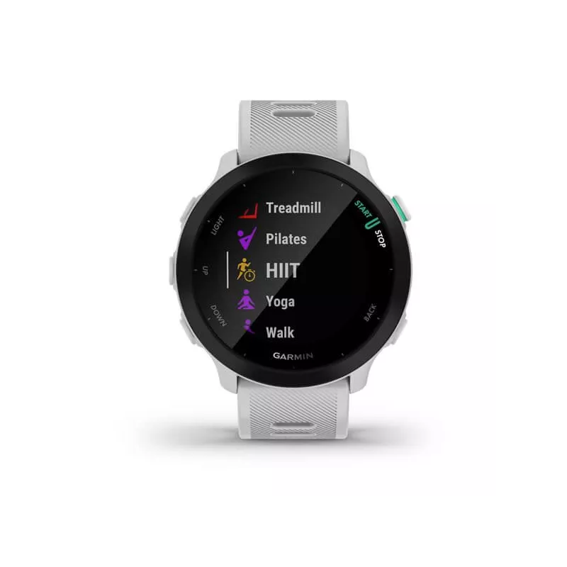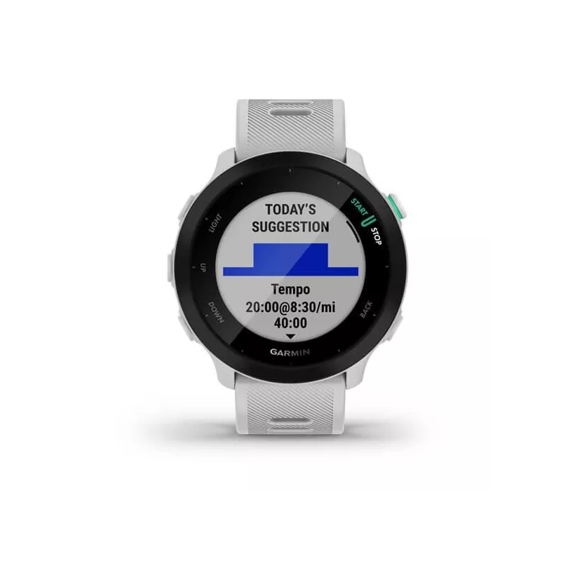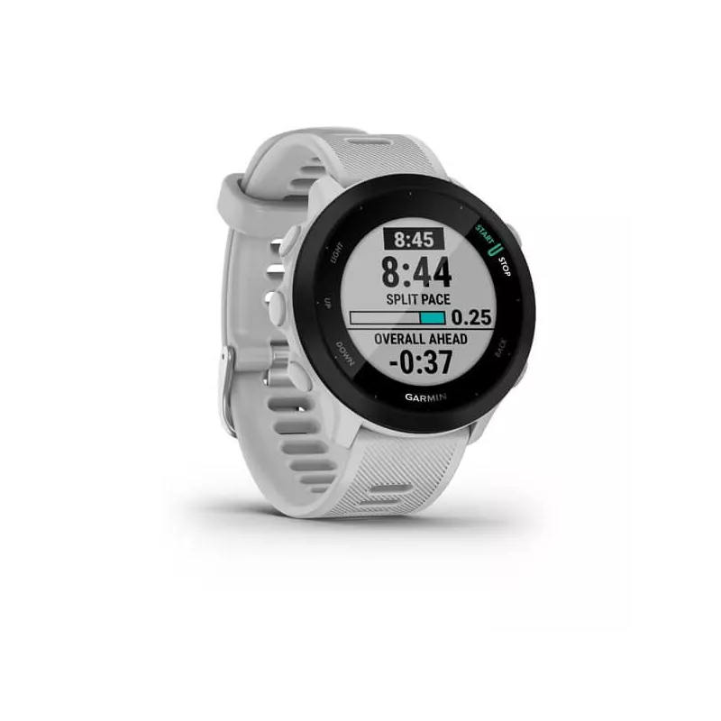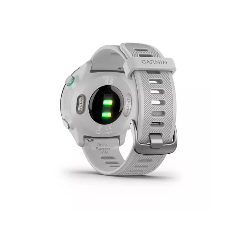 - GARMIN FORERUNNER 55. DISPLAY DIAGONAL: 2.64 CM (1.04"), DISPLAY TECHNOLOGY: MIP, DISPLAY RESOLUTION: 208 X 208 PIXELS. GPS (SATELLITE). WEIGHT: 37 G. BAND MATERIAL: SILICONE, BAND COLOUR: WHITE