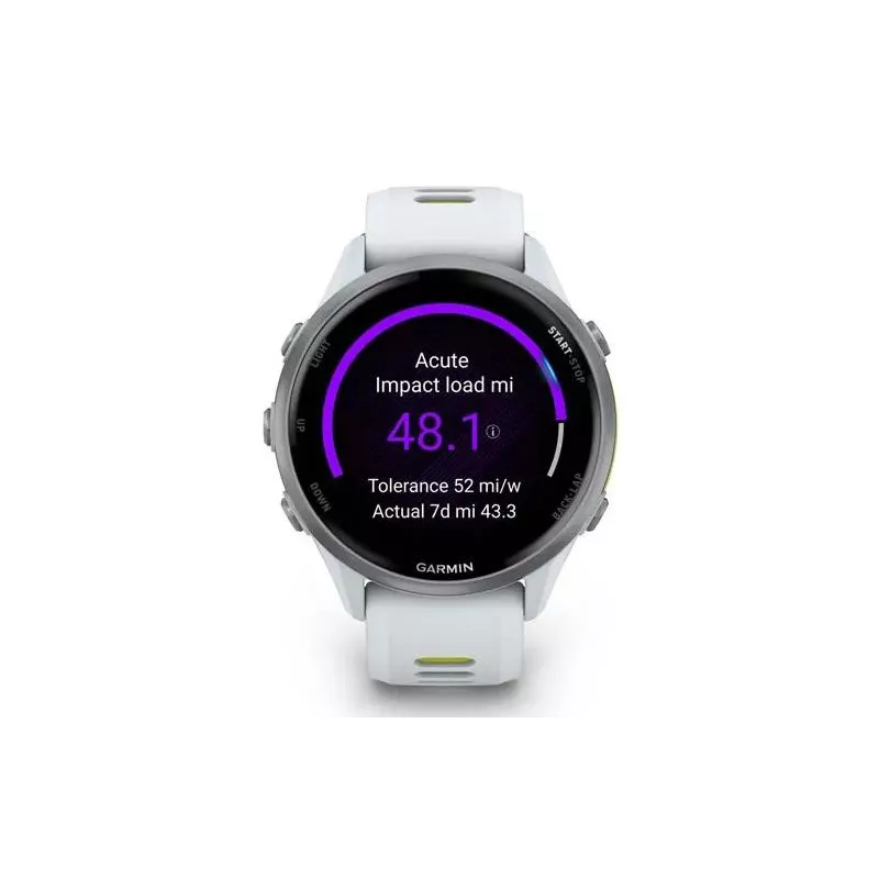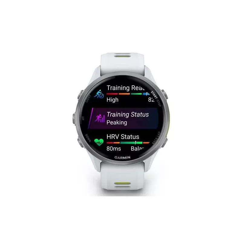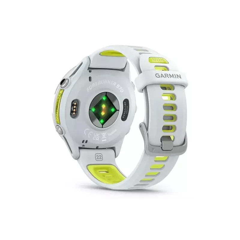Forerunner 970 , AMOLED , 3.56 cm (1.4") , Display type Digital , Display resolution 454 x 454 pixels , Touchscreen Yes , Band material Silicone , Band size S , Shape Round , Market positioning Smartwatch , Watch case colour White , Watch case material Titanium , Band colour Yellow/White , Heart rate monitor Yes , USB port Yes , Wi-Fi Yes , Battery type Built-in battery , Battery technology Lithium-Ion (Li-Ion) , Battery life (max) 360 h , Battery life 15 day(s) , Weight 56 g