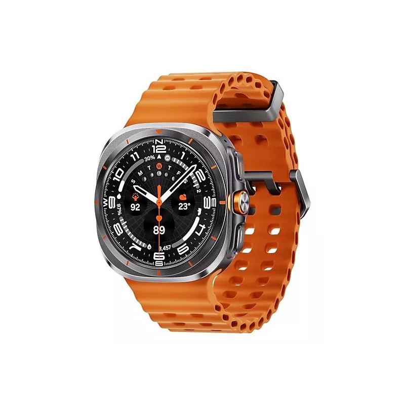 Galaxy Watch Ultra LTE(2025) , 3.81 cm (1.5") , AMOLED , Brightness 600 cd/m² , Display type Digital , Display resolution 480 x 480 pixels , Touchscreen Yes , Operating system installed Wear OS , RAM capacity 2000 MB , Flash memory 64 GB , Shape Round , Market positioning Smartwatch , Watch case size 47 mm , Watch case colour Grey/Titanium , Watch case material Titanium , Band colour Orange , Heart rate monitor Yes , Near Field Communication (NFC) Yes , Wi-Fi Yes , Bluetooth version 5.3 , Battery type Built-in battery , Battery capacity 590 mAh , Charging time 1.6 h , Weight 60.5 g