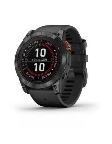 fenix 7X Pro – Solar Edition , 3.56 cm (1.4") , MIP , Display type Digital , Display resolution 280 x 280 pixels , Touchscreen Yes , Watch glass type Power Glass , Flash memory 32 GB , Band material Silicone , Shape Round , Market positioning Sport watch , Watch case size 51 mm , Watch case colour Grey , Watch case material Fibre Reinforced Plastic (FRP),Stainless steel , Band colour Black , Heart rate monitor Yes , Near Field Communication (NFC) Yes , Wi-Fi Yes , Battery type Built-in battery , Battery life 37 day(s) , Weight 96 g