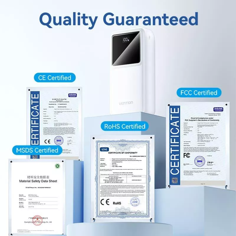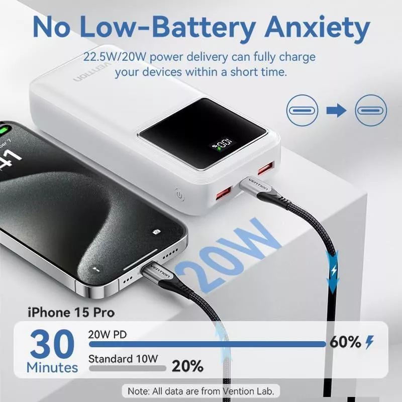 - VENTION FHMW0. BATTERY CAPACITY: 30000 MAH, FAST CHARGING TECHNOLOGY: ADAPTIVE FAST CHARGING, POWER DELIVERY 3.0, QUICK CHARGE 3.0, BATTERY VOLTAGE: 3.7 V. USB TYPE-A OUTPUT PORTS: 2, USB TYPE-C PORTS QUANTITY: 1. TOTAL OUTPUT POWER: 22.5 W, OUTPUT CURREN