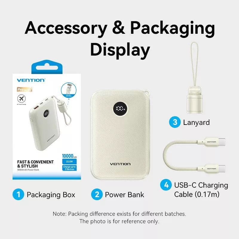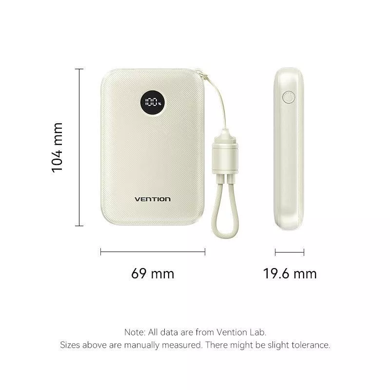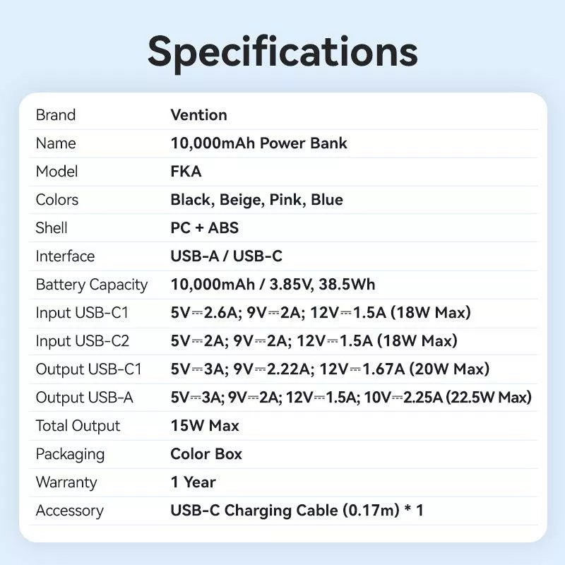 - VENTION FKAN0-C. BATTERY CAPACITY: 10000 MAH. USB TYPE-A OUTPUT PORTS: 1, USB TYPE-C PORTS QUANTITY: 2. TOTAL OUTPUT POWER: 22.5 W. PRODUCT COLOUR: BEIGE
