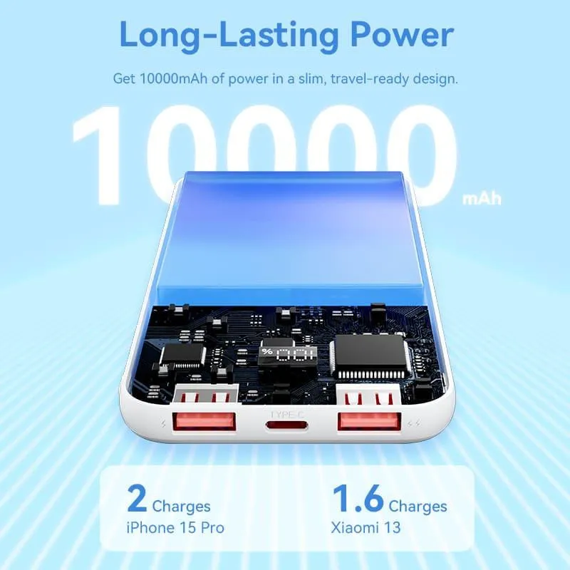 Capacity 10000 mAh , Battery capacity 37 Wh , Fast charging Yes , USB Power Delivery up to 22.5 W , 3xNumber of simultaneously connected devices (max) , Colour Black , Housing material ABS,Polycarbonate (PC) , Charger compatibility Headphones/Headset,Mobile phone/Smartphone,Smartwatch,Tablet , Built-in display Yes , Input interface Micro-USB + USB Type-C , Total output power 22.5 W , Output current 3 A , Output voltage 5 V , Product Net Weight 0.22 kg