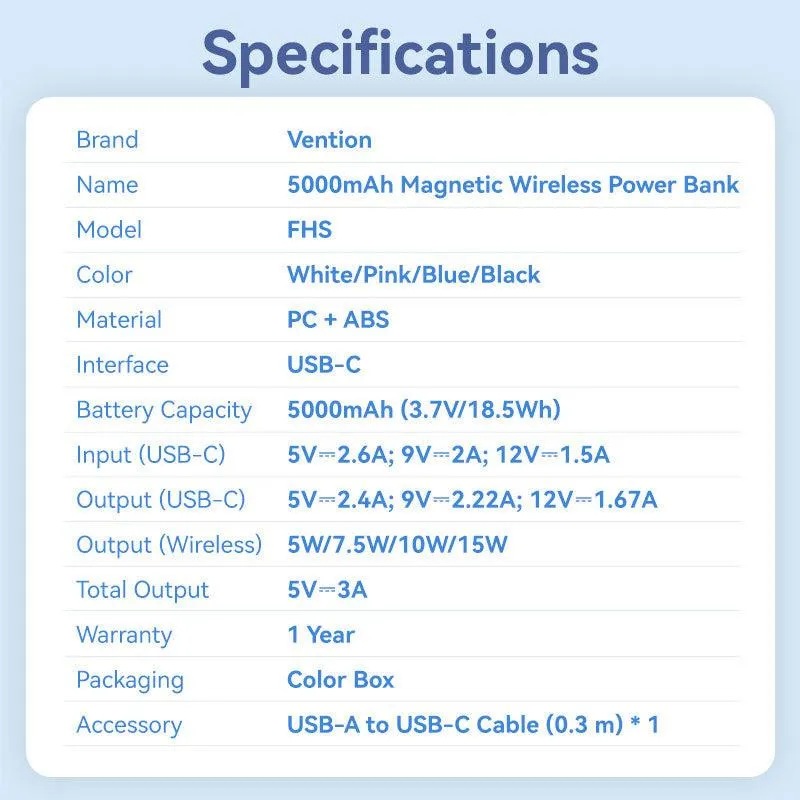 - VENTION FHSB0. BATTERY CAPACITY: 5000 MAH, BATTERY VOLTAGE: 3.7 V. USB TYPE-C PORTS QUANTITY: 1. WIRELESS CHARGING. OUTPUT CURRENT: 3 A. PRODUCT COLOUR: BLACK