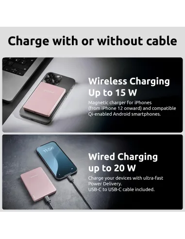 Lithium Polymer (LiPo) , Capacity 5000 mAh , Wireless charging Yes , Fast charging Yes , USB Power Delivery up to 20 W , 1xNumber of simultaneously connected devices (max) , Colour Rose , Charger compatibility Mobile phone/Smartphone , Input interface USB Type-C , Output voltage 5, 9, 12 V , Cables included USB Type-C to USB Type-C , Product Net Weight 0.213 kg