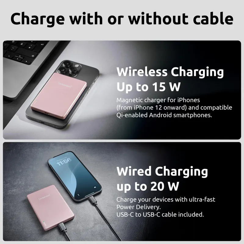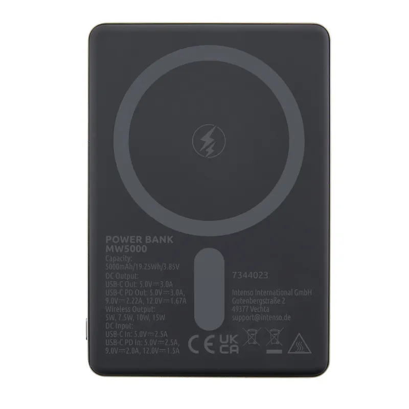 - INTENSO MW5000 MAGNETIC POWER BANK 5000 MAH MAGSAFE COMPATIBLE, 15W WIRELESS CHARGING, 20W USB-C PD, SLIM & COMPACT TESTED IN GERMANY ROS . BATTERY CAPACITY: 5000 MAH, BATTERY TECHNOLOGY: LITHIUM POLYMER (LIPO), FAST CHARGING TECHNOLOGY: POWER DELIVERY, P