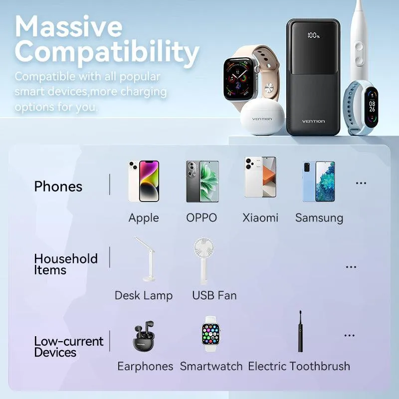 - VENTION FHPW0. BATTERY CAPACITY: 20000 MAH, BATTERY VOLTAGE: 3.7 V. USB TYPE-A OUTPUT PORTS: 2, USB TYPE-C PORTS QUANTITY: 1. TOTAL OUTPUT POWER: 22.5 W. PRODUCT COLOUR: WHITE