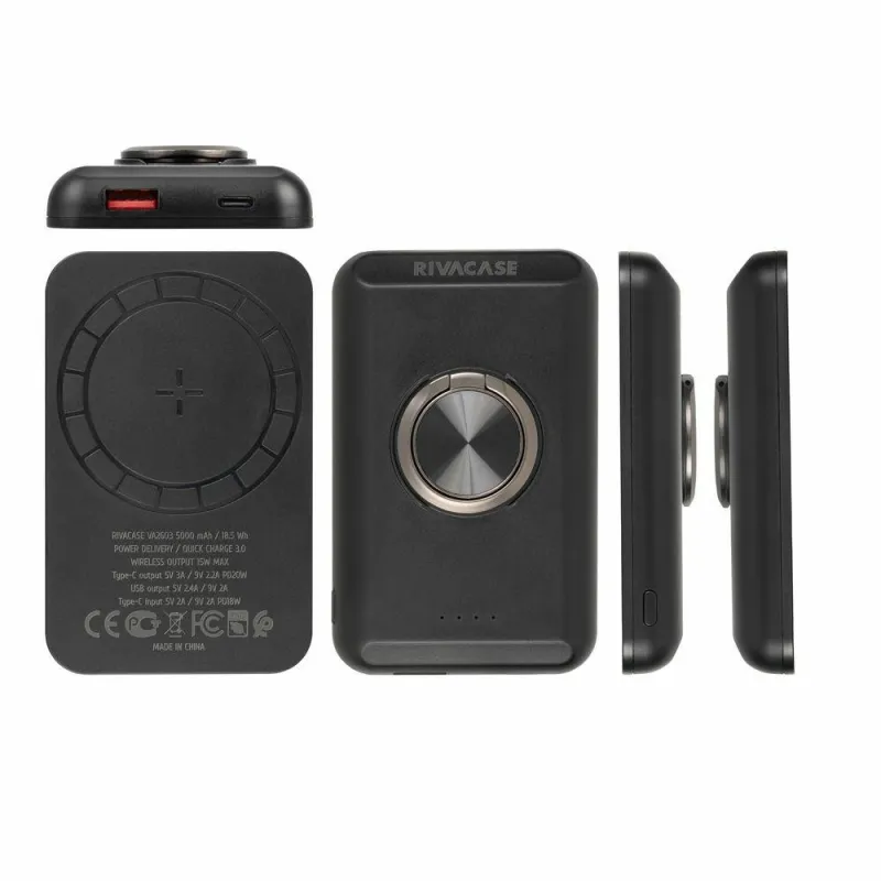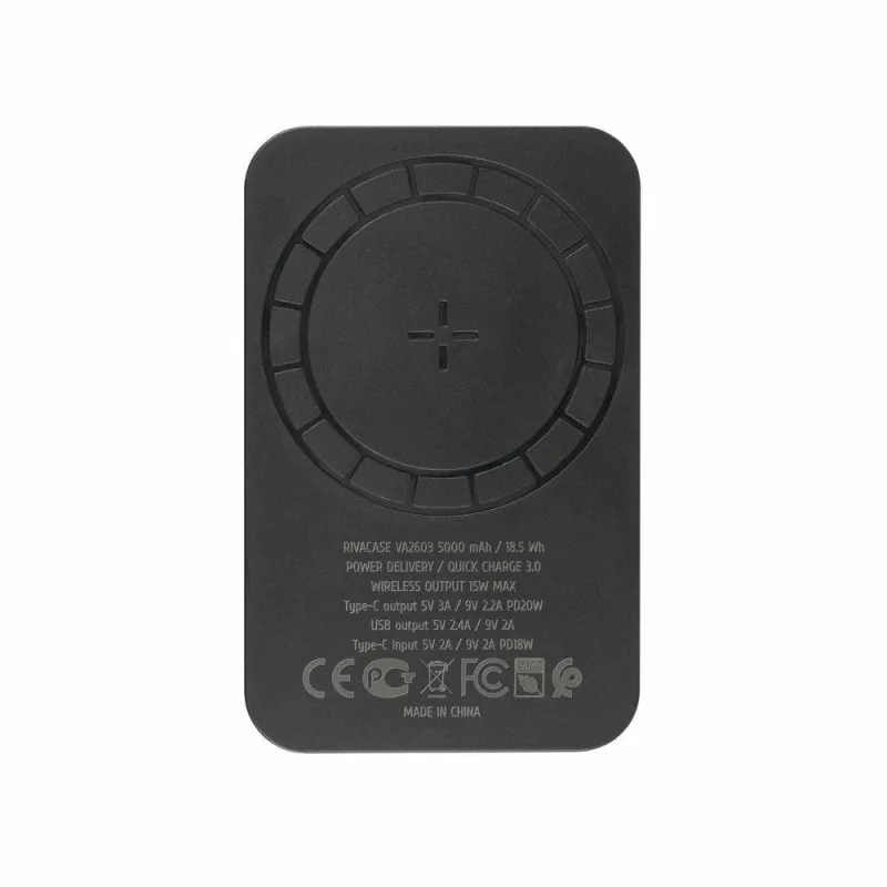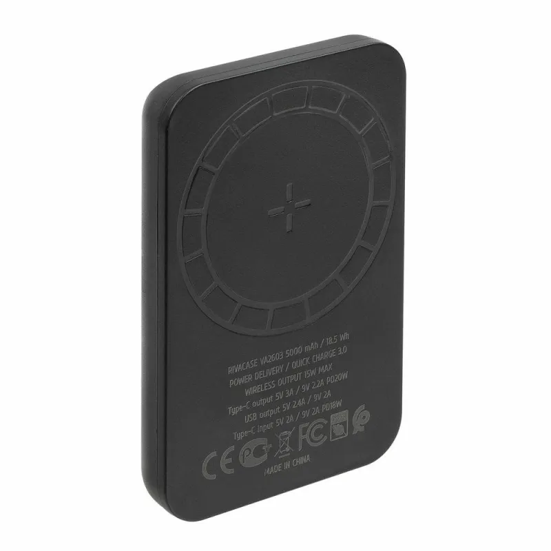 - RIVACASE VA2603. BATTERY CAPACITY: 5000 MAH, BATTERY TECHNOLOGY: LITHIUM POLYMER (LIPO), FAST CHARGING TECHNOLOGY: QUICK CHARGE 3.0, BATTERY VOLTAGE: 3.7 V. USB TYPE-A OUTPUT PORTS: 1, USB TYPE-C PORTS QUANTITY: 1. WIRELESS CHARGING. PRODUCT COLOUR: BLACK