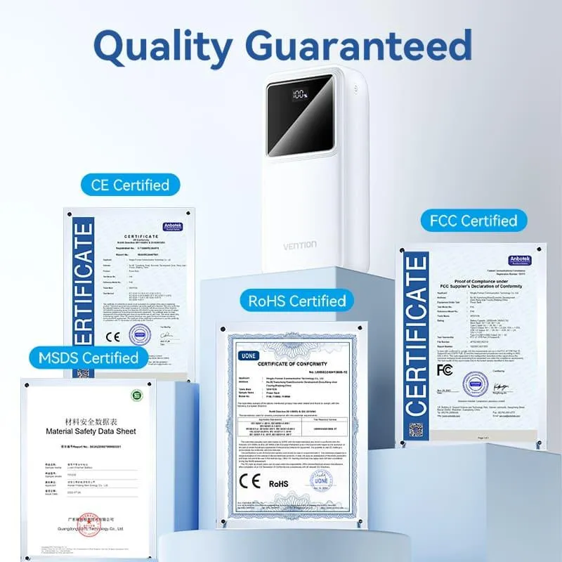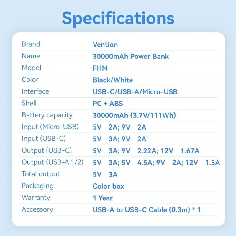 - VENTION FHMB0. BATTERY CAPACITY: 30000 MAH, FAST CHARGING TECHNOLOGY: ADAPTIVE FAST CHARGING, POWER DELIVERY 3.0, QUICK CHARGE 3.0, BATTERY VOLTAGE: 3.7 V. USB TYPE-A OUTPUT PORTS: 2, USB TYPE-C PORTS QUANTITY: 1. TOTAL OUTPUT POWER: 22.5 W, OUTPUT CURREN