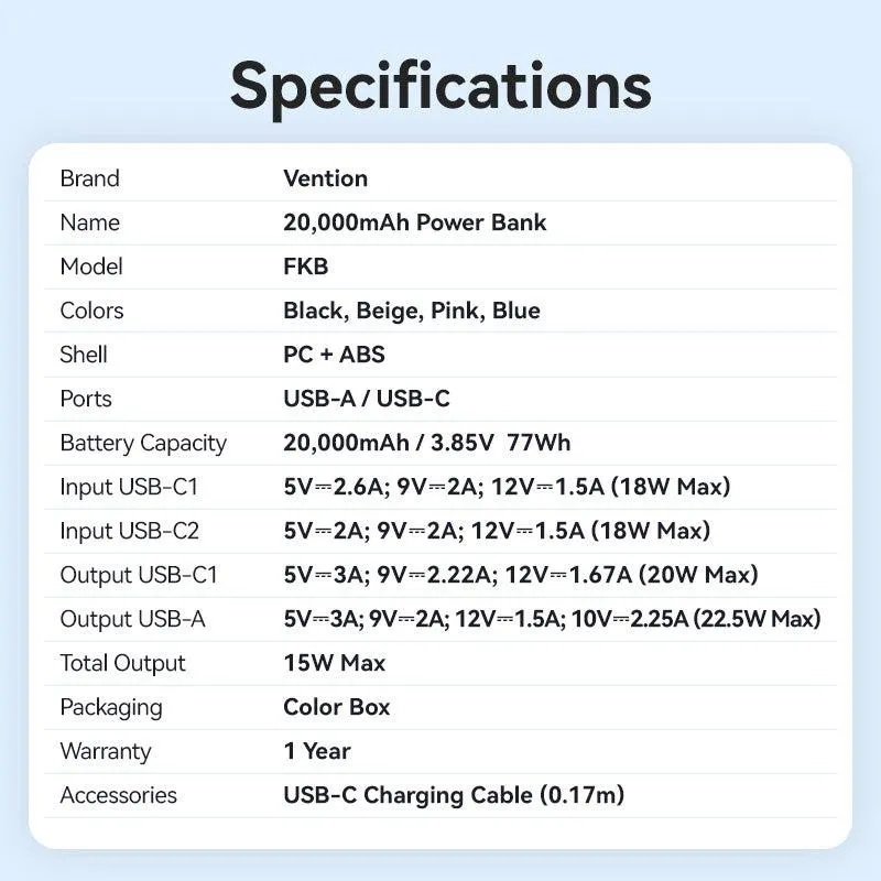 - VENTION 20000MAH POWER BANK 22.5W. BATTERY CAPACITY: 20000 MAH, BATTERY VOLTAGE: 3.85 V. USB TYPE-A OUTPUT PORTS: 1, USB TYPE-C PORTS QUANTITY: 2. PRODUCT COLOUR: PINK