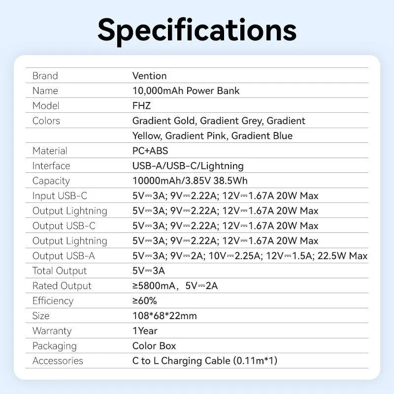 - VENTION FHZM0. BATTERY CAPACITY: 10000 MAH, BATTERY VOLTAGE: 3.85 V. USB TYPE-A OUTPUT PORTS: 1, USB TYPE-C PORTS QUANTITY: 1. OUTPUT CURRENT: 3 A. PRODUCT COLOUR: GREY