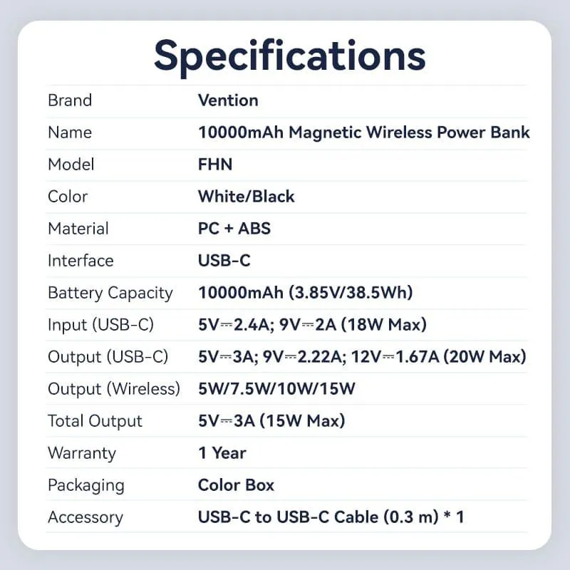 - VENTION 10000MAH MAGNETIC WIRELESS POWER BANK 20W. BATTERY CAPACITY: 10000 MAH, BATTERY VOLTAGE: 3.85 V. USB TYPE-C PORTS QUANTITY: 1. WIRELESS CHARGING. OUTPUT CURRENT: 3 A. PRODUCT COLOUR: BLACK