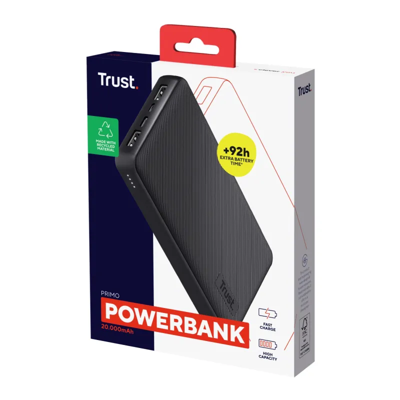 - TRUST PRIMO. BATTERY CAPACITY: 20000 MAH, BATTERY TECHNOLOGY: LITHIUM-ION (LI-ION), BATTERY VOLTAGE: 3.7 V. USB TYPE-A OUTPUT PORTS: 2, USB TYPE-C PORTS QUANTITY: 1. TOTAL OUTPUT POWER: 15 W. PRODUCT COLOUR: BLACK