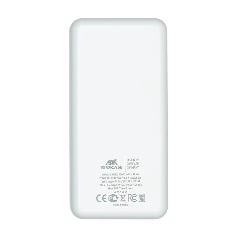 - RIVACASE VA2572. BATTERY CAPACITY: 20000 MAH, BATTERY TECHNOLOGY: LITHIUM POLYMER (LIPO), FAST CHARGING TECHNOLOGY: QUICK CHARGE 3.0, BATTERY VOLTAGE: 3.7 V. TOTAL OUTPUT POWER: 20 W. PRODUCT COLOUR: WHITE