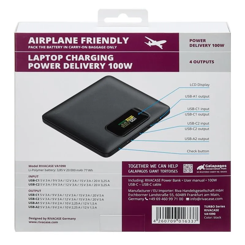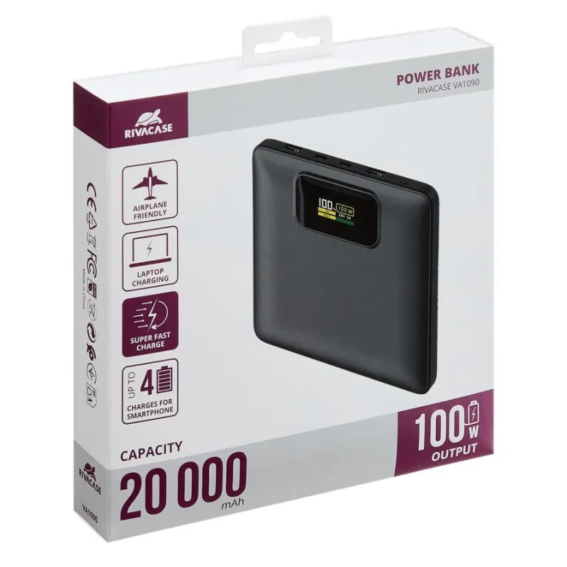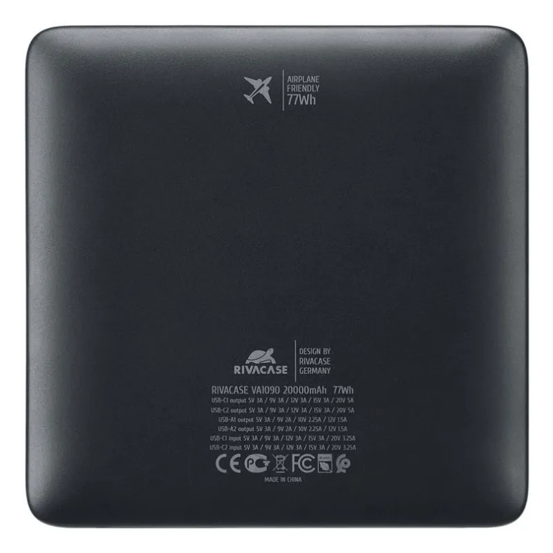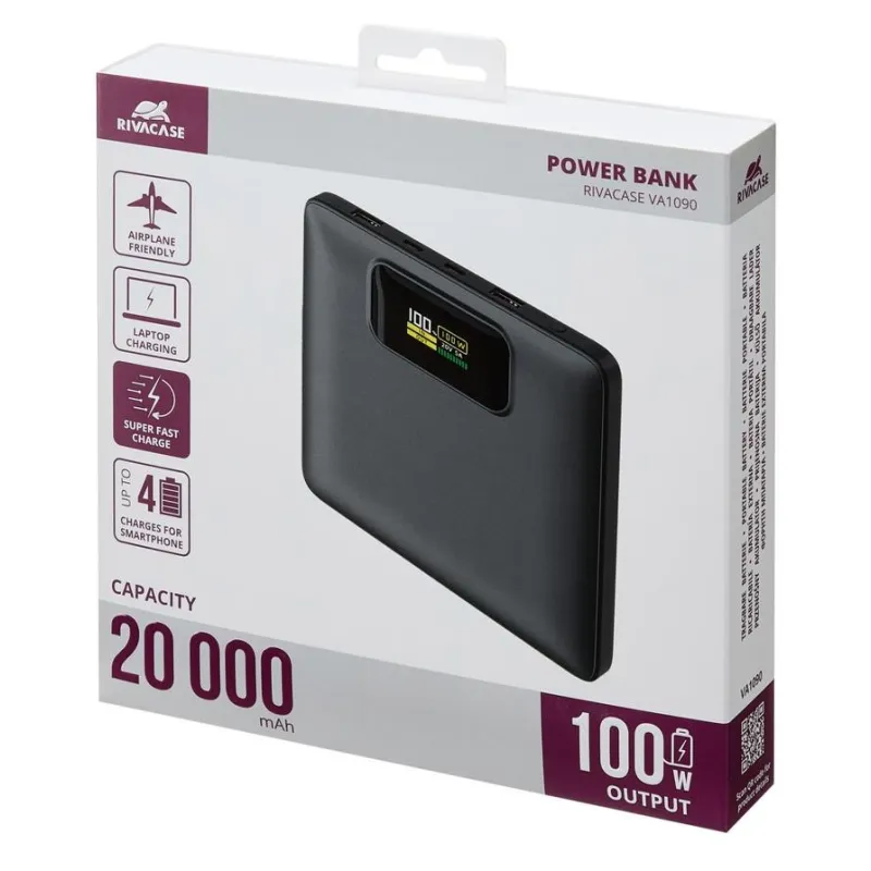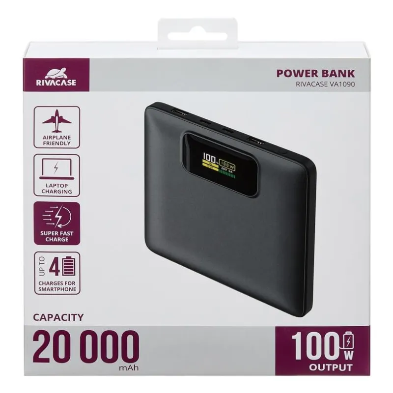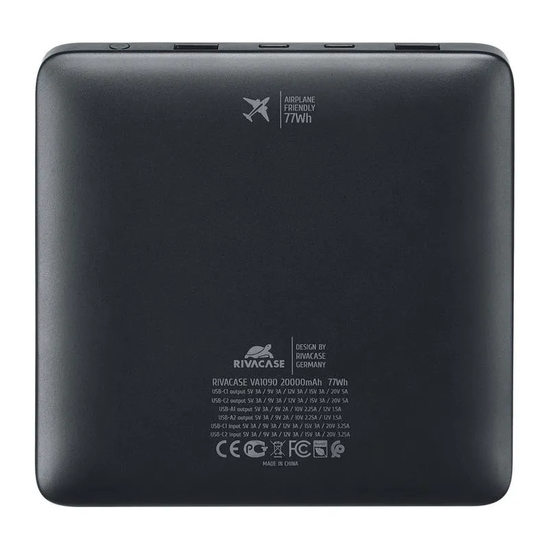 - RIVACASE TURBO. BATTERY CAPACITY: 20000 MAH, BATTERY TECHNOLOGY: LITHIUM POLYMER (LIPO), FAST CHARGING TECHNOLOGY: POWER DELIVERY 3.0, QUICK CHARGE 3.0, BATTERY VOLTAGE: 3.85 V. USB TYPE-A OUTPUT PORTS: 2, USB TYPE-C PORTS QUANTITY: 2. OUTPUT CURRENT: 5 A