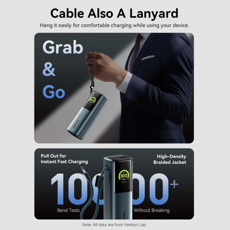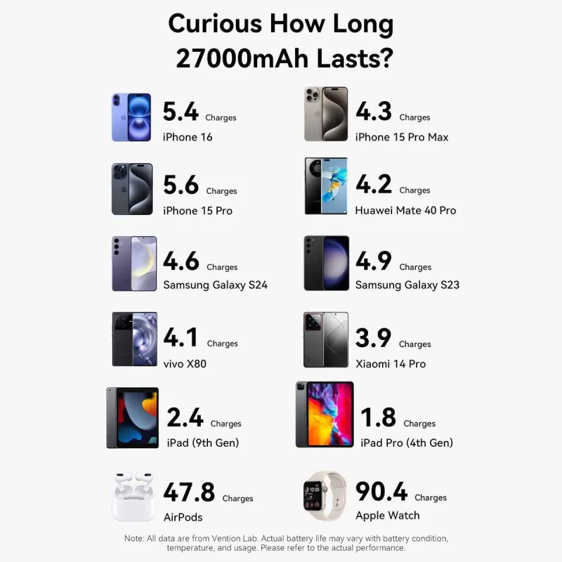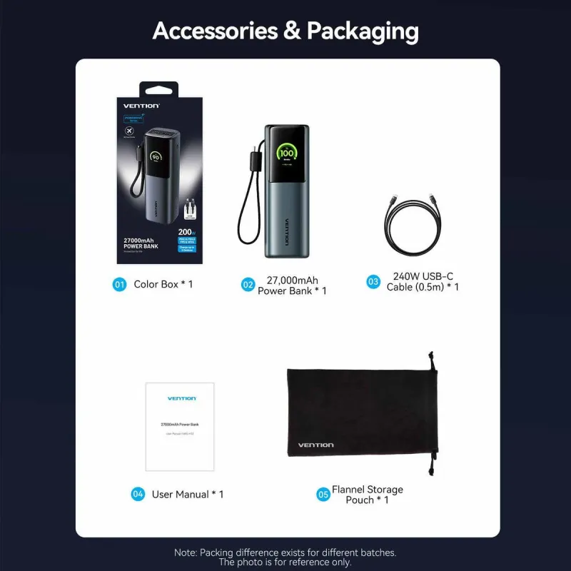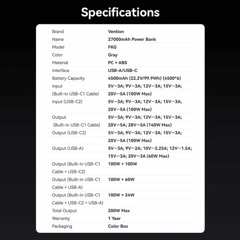 - VENTION 27000MAH POWER BANK 200W. BATTERY CAPACITY: 27000 MAH, FAST CHARGING TECHNOLOGY: POWER DELIVERY 3.1, PROGRAMMABLE POWER SUPPLY (PPS), BATTERY VOLTAGE: 22.2 V. USB TYPE-A OUTPUT PORTS: 1, USB TYPE-C PORTS QUANTITY: 2. TOTAL OUTPUT POWER: 200 W. PRO