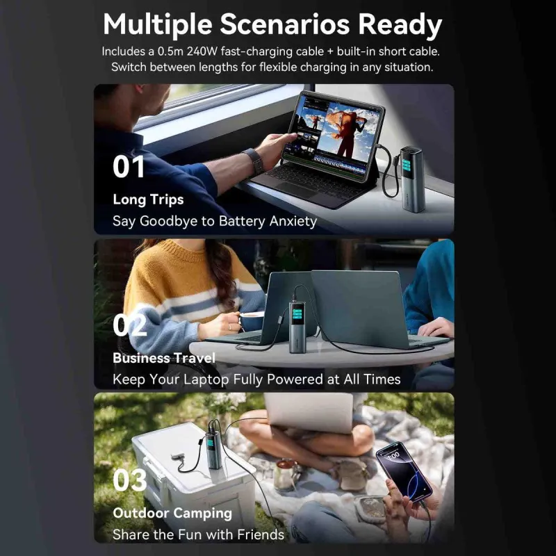 Capacity 27000 mAh , Battery capacity 99.9 Wh , Fast charging Yes , USB Power Delivery up to 200 W , 3xNumber of simultaneously connected devices (max) , Colour Grey , Housing material ABS,Polycarbonate (PC) , Charger compatibility Universal , Built-in display Yes , Input interface USB Type-C , Total output power 200 W , Output voltage 5/9/12/15/20/28 V , Cables included USB Type-C to USB Type-C , Travel pouch Yes , Product Net Weight 0.65 kg