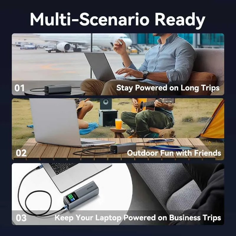 Capacity 27000 mAh , Battery capacity 99.9 Wh , Fast charging Yes , USB Power Delivery up to 140 W , 3xNumber of simultaneously connected devices (max) , Colour Grey , Housing material Aluminium,Polycarbonate (PC) , Charger compatibility Universal , Built-in display Yes , Input interface USB Type-C , Total output power 140 W , Output voltage 5/9/12/15/20/28 V , Cables included USB Type-C to USB Type-C , Travel pouch Yes , Product Net Weight 0.855 kg