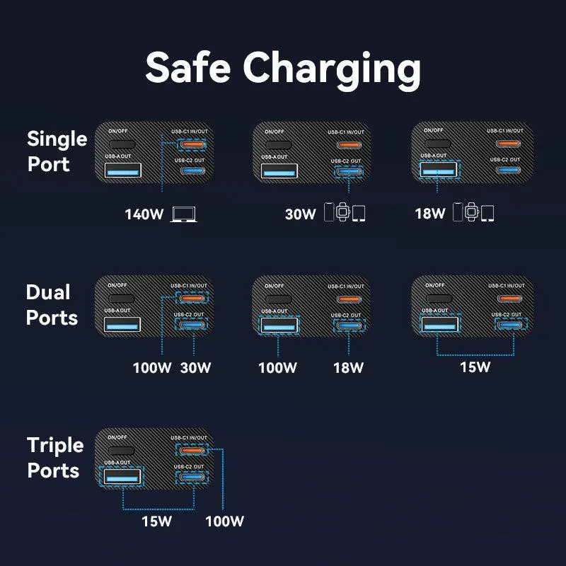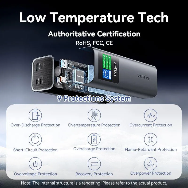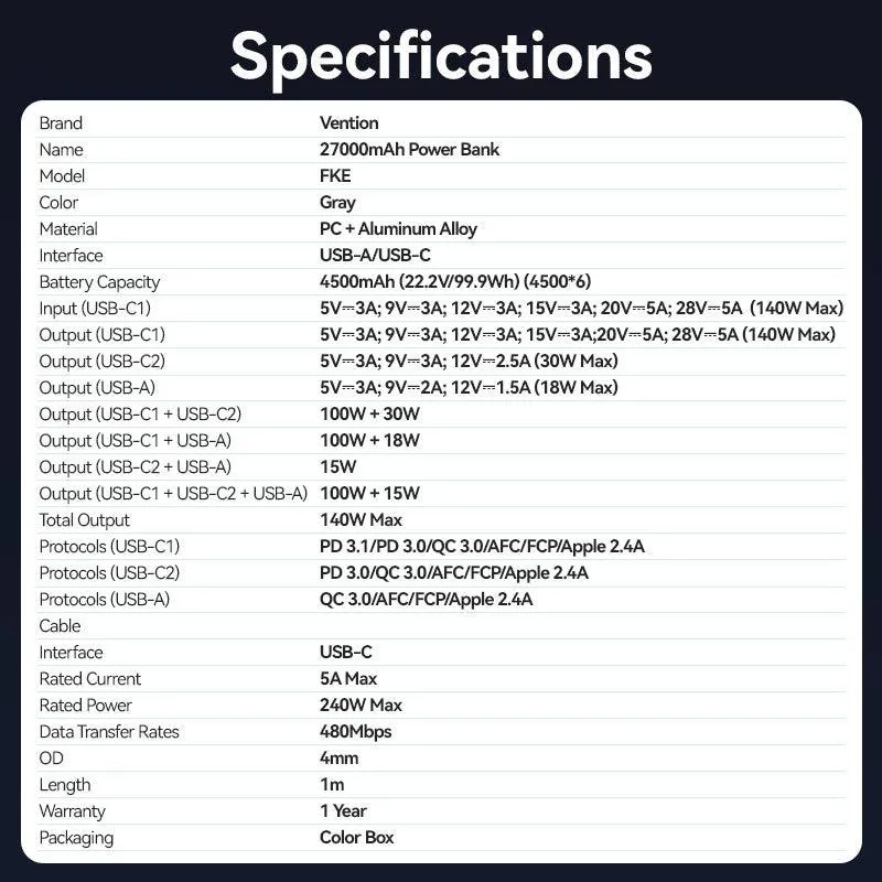 - VENTION 27000MAH POWER BANK 140W. BATTERY CAPACITY: 27000 MAH, FAST CHARGING TECHNOLOGY: ADAPTIVE FAST CHARGING, POWER DELIVERY 3.0, POWER DELIVERY 3.1, QUICK CHARGE 3.0, BATTERY VOLTAGE: 22.2 V. USB TYPE-A OUTPUT PORTS: 1, USB TYPE-C PORTS QUANTITY: 2. T
