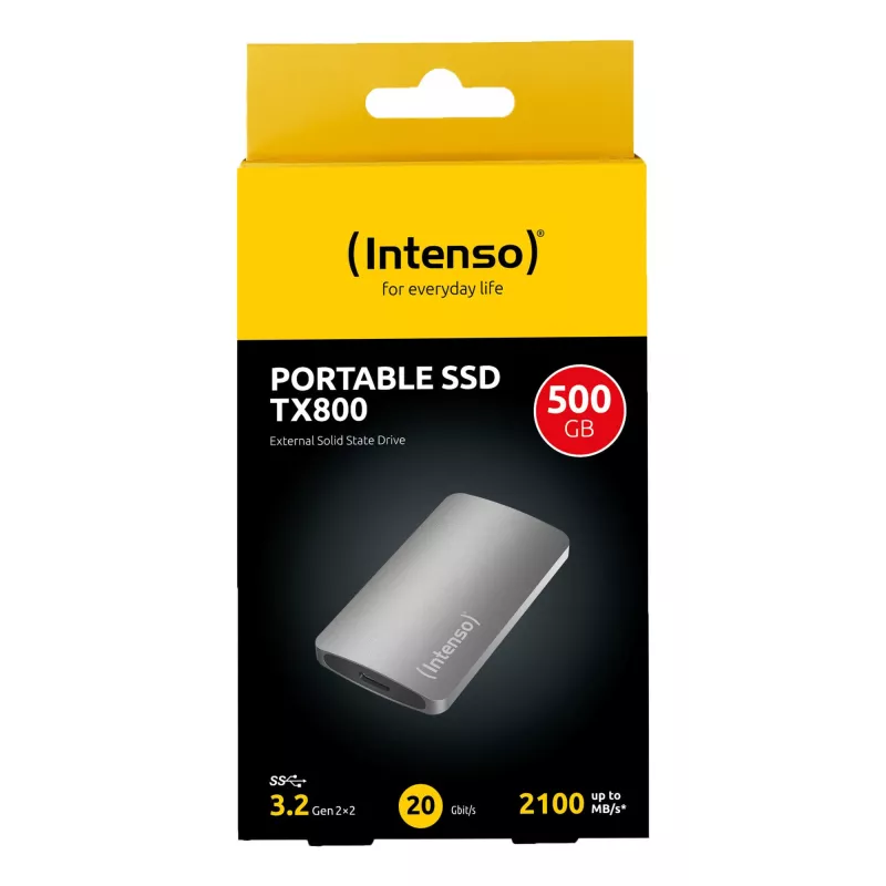- INTENSO TX800. SSD CAPACITY: 500 GB. USB CONNECTOR: USB TYPE-C, USB VERSION: USB 3.2 GEN 2X2, DATA TRANSFER RATE: 2.1 GBIT/S. PRODUCT COLOUR: ANTHRACITE