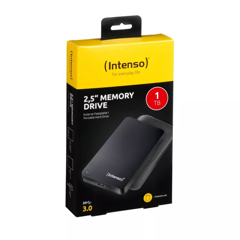 INTENSO MEMORY DRIVE, 1TB. HDD CAPACITY: 1 TB, HDD SIZE: 2.5". USB VERSION: 3.2 GEN 1 (3.1 GEN 1). HDD SPEED: 5400 RPM, READ SPEED: 85 MB/S, WRITE SPEED: 75 MB/S. PRODUCT COLOUR: BLACK