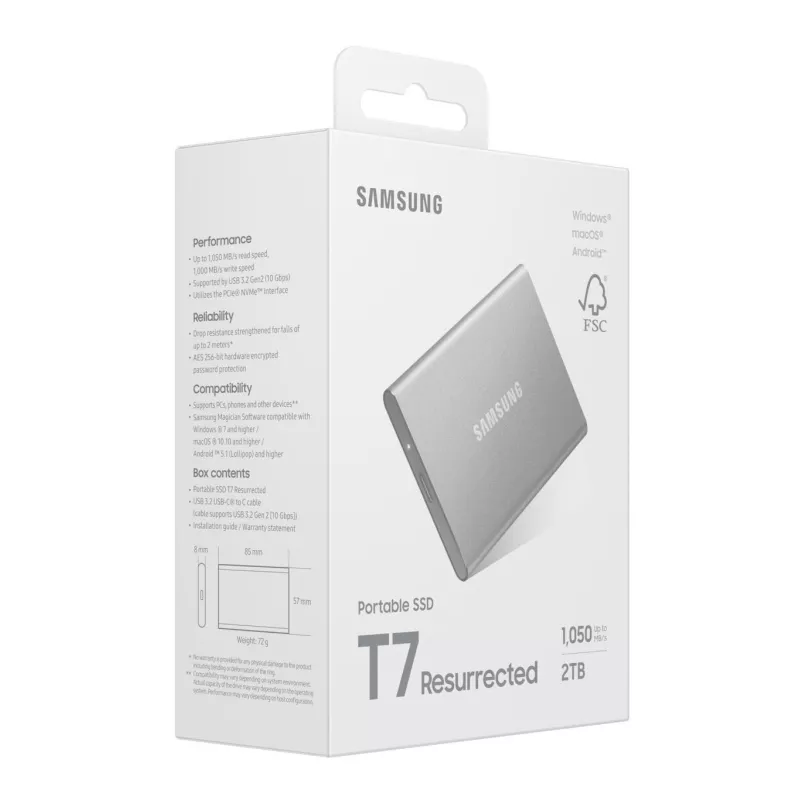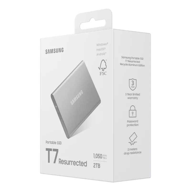 SAMSUNG MU-PD2T0G/WW. SSD CAPACITY: 2 TB. USB CONNECTOR: USB TYPE-C, USB VERSION: 3.2 GEN 2 (3.1 GEN 2). READ SPEED: 1050 MB/S, WRITE SPEED: 1000 MB/S. DATA TRANSFER RATE: 10 GBIT/S. PASSWORD PROTECTION. PRODUCT COLOUR: SILVER