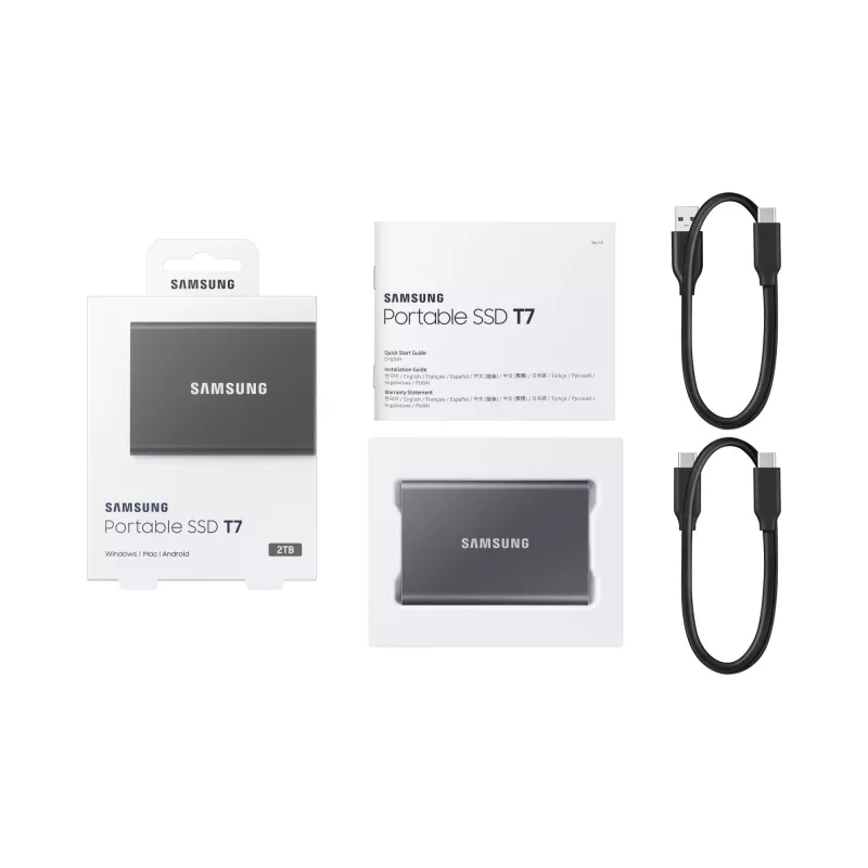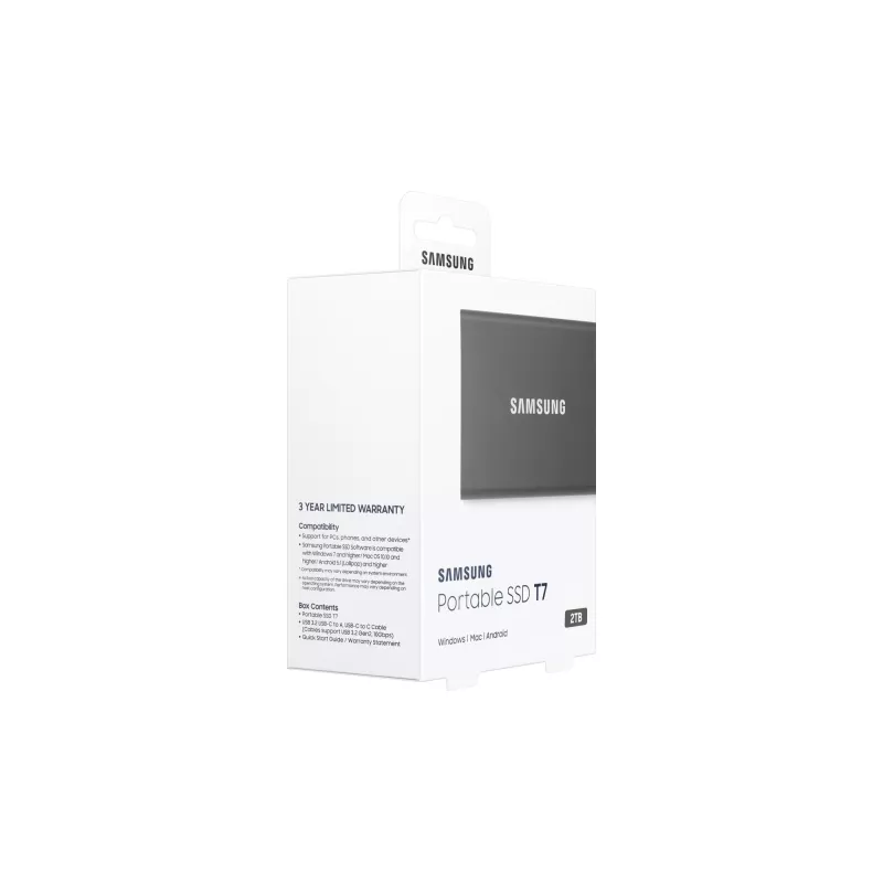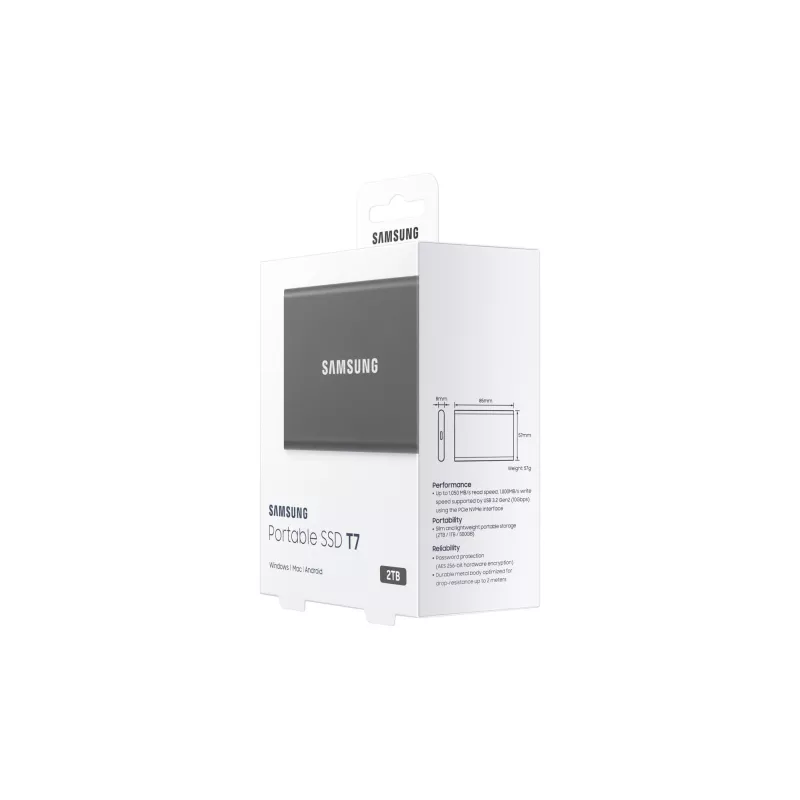 SAMSUNG PORTABLE SSD T7. SSD CAPACITY: 2 TB. USB CONNECTOR: USB TYPE-C, USB VERSION: 3.2 GEN 2 (3.1 GEN 2). READ SPEED: 1050 MB/S, WRITE SPEED: 1000 MB/S. PASSWORD PROTECTION. PRODUCT COLOUR: GREY