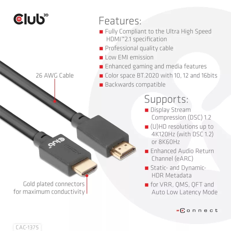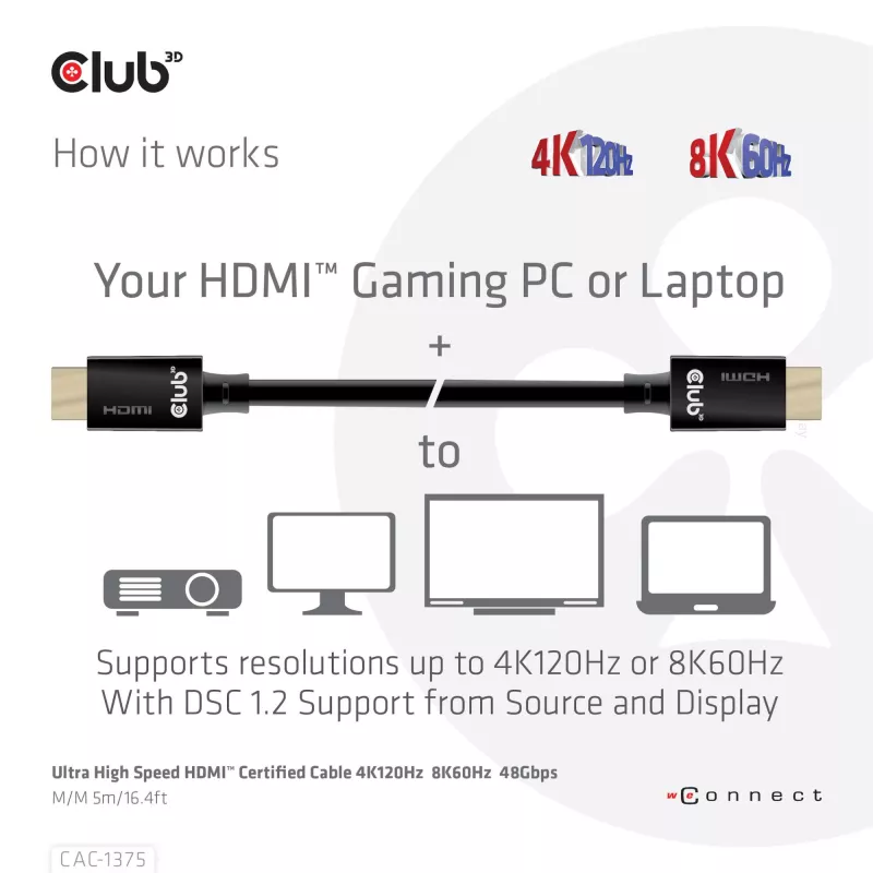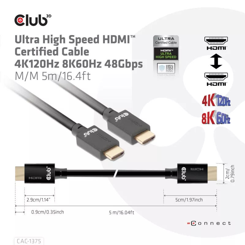 - CLUB3D ULTRA HIGH SPEED HDMI CERTIFIED CABLE 4K120HZ 8K60HZ 48GBPS M/M 5M/16.4FT. CABLE LENGTH: 5 M, CONNECTOR 1: HDMI TYPE A (STANDARD), CONNECTOR 1 GENDER: MALE, CONNECTOR 2: HDMI TYPE A (STANDARD), CONNECTOR 2 GENDER: MALE, CONNECTOR CONTACTS PLATING: