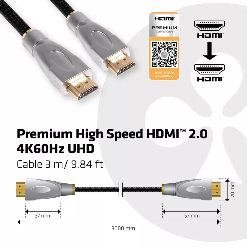 - CLUB3D HDMI 2.0 CABLE 3METER UHD 4K/60HZ 18GBPS CERTIFIED PREMIUM HIGH SPEED. CABLE LENGTH: 3 M, CONNECTOR 1: HDMI TYPE A (STANDARD), CONNECTOR 1 GENDER: MALE, CONNECTOR 2: HDMI 2.0, CONNECTOR 2 GENDER: MALE, CONNECTOR CONTACTS PLATING: GOLD, HDMI VERSION