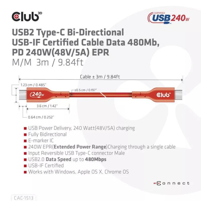 CABLE USB-C TO USB-C 3M/M/M CAC-1513 CLUB3D