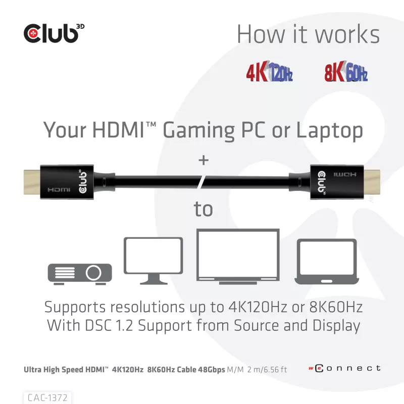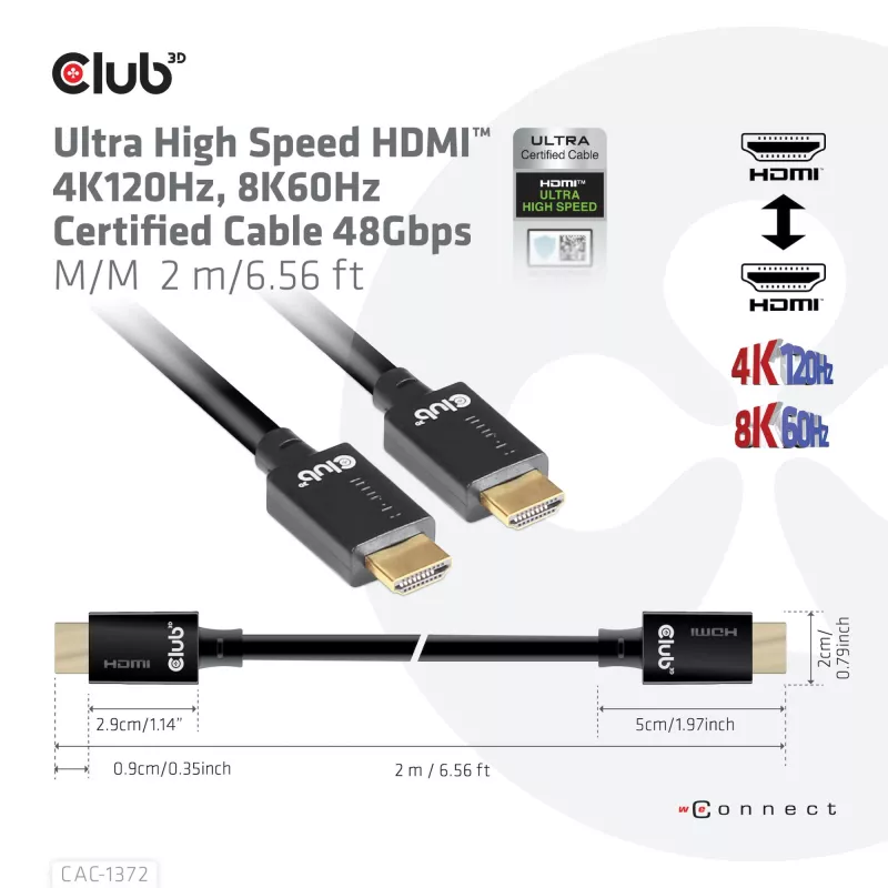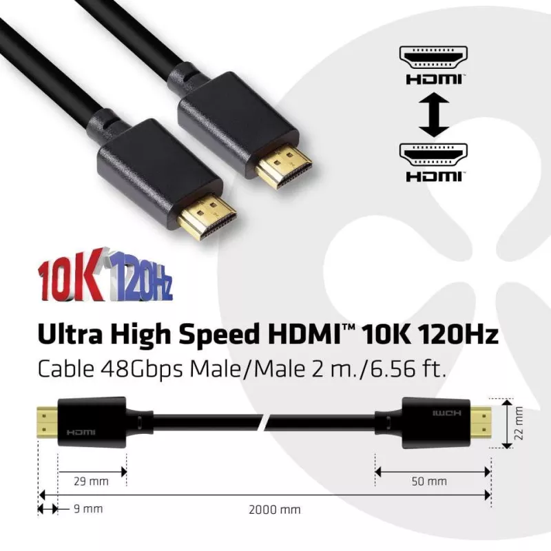 - CLUB3D ULTRA HIGH SPEED HDMI 4K120HZ, 8K60HZ CERTIFIED CABLE 48GBPS M/M 2 M / 6.56 FT. CABLE LENGTH: 2 M, CONNECTOR 1: HDMI TYPE A (STANDARD), CONNECTOR 1 GENDER: MALE, CONNECTOR 2: HDMI TYPE A (STANDARD), CONNECTOR 2 GENDER: MALE, CONNECTOR CONTACTS PLAT