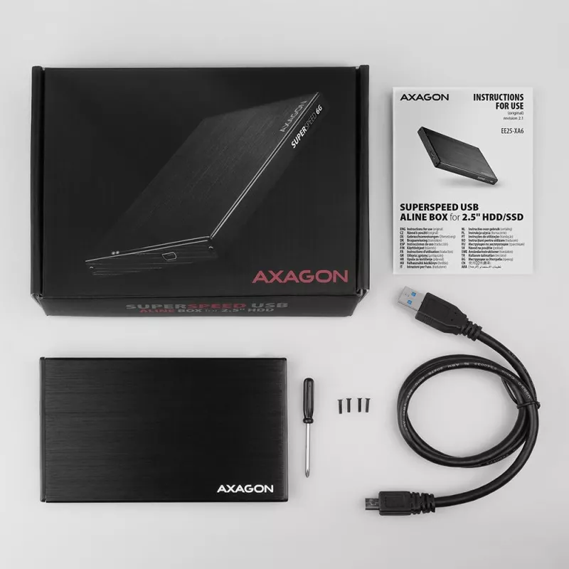 - USB 3.2 GEN 1 EXTERNAL BOX FOR 2.5" SATA SSD, MICRO USB-B - USB-A CABLE 64 CM LONG, MOUNTING SCREWS AND THE SCREWDRIVER