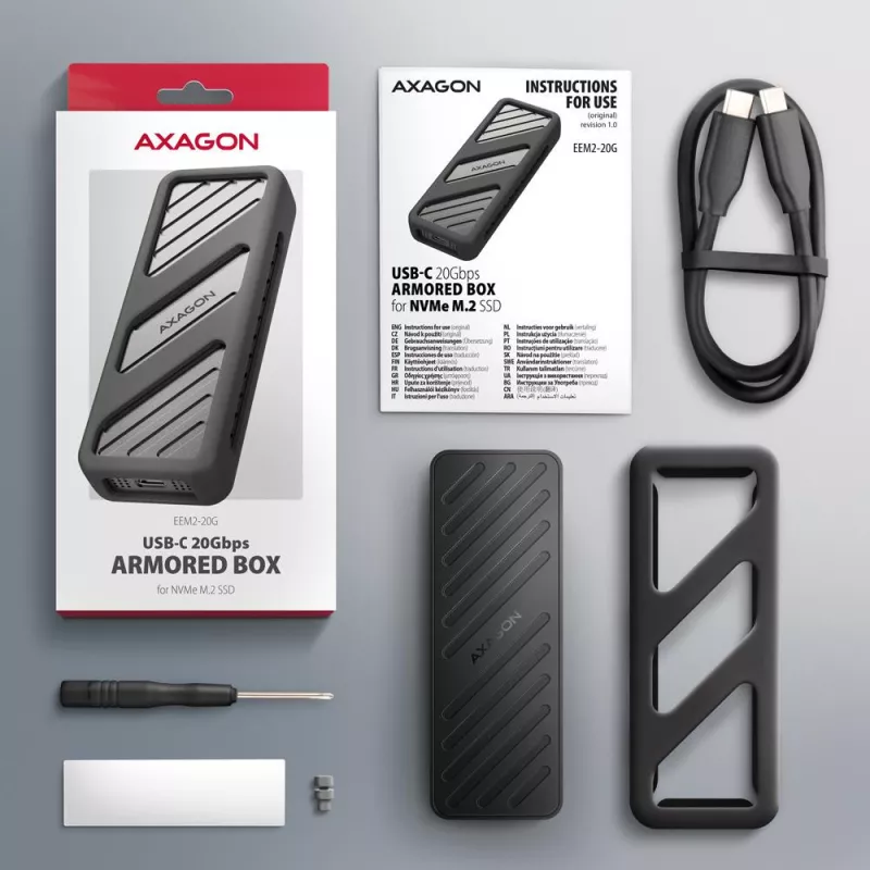 - USB-C 20GBPS EXTERNAL BOX FOR M.2 SSD, SILICONE SLEEVE, USB-C USB-C CABLE 38 CM LONG, 1 THERMAL CONDUCTIVE PAD, MOUNTING KIT AND SCREWDRIVER