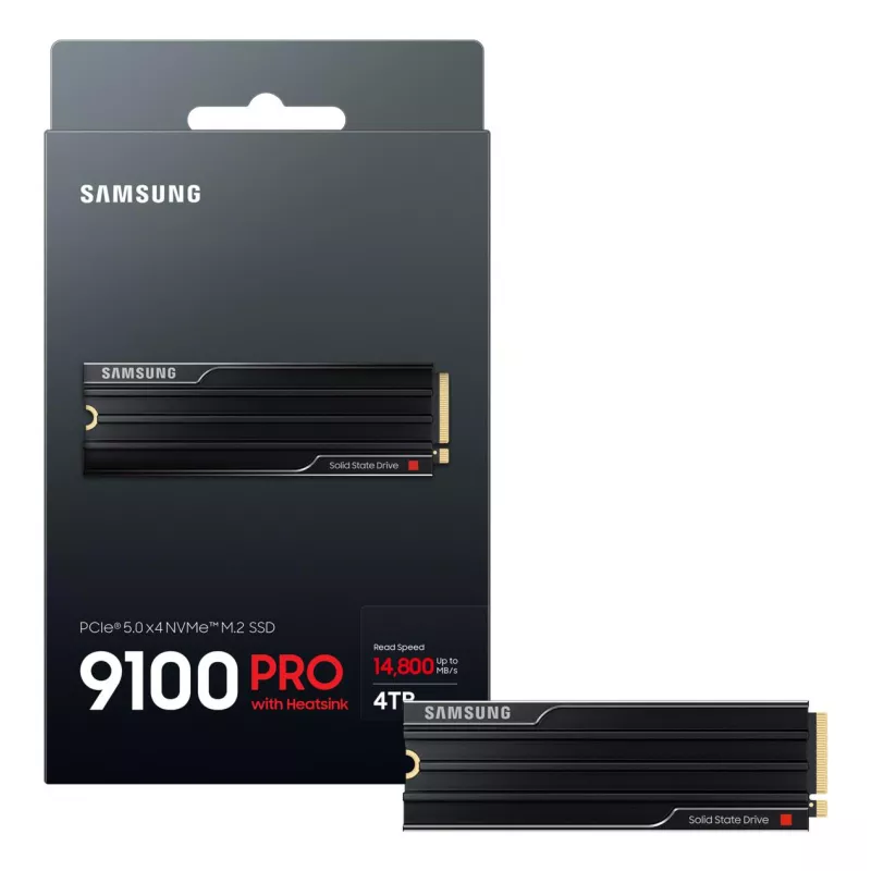- SAMSUNG 9100 PRO HEATSINK PCIE 5.0 NVME M.2 SSD - 4 TB. SSD CAPACITY: 4 TB, SSD FORM FACTOR: M.2, READ SPEED: 14800 MB/S, WRITE SPEED: 13400 MB/S, COMPONENT FOR: PC/GAME CONSOLE