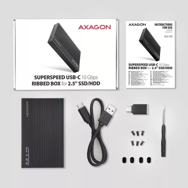 - USB-C 3.2 GEN 2 EXTERNAL BOX FOR 2.5" SATA DISK, USB-C - USB-A CABLE 60 CM LONG, USB-A - USB-C ADAPTER, SELF-ADHESIVE RUBBER PADS, MOUNTING MATERIAL AND SCREWDRIVER