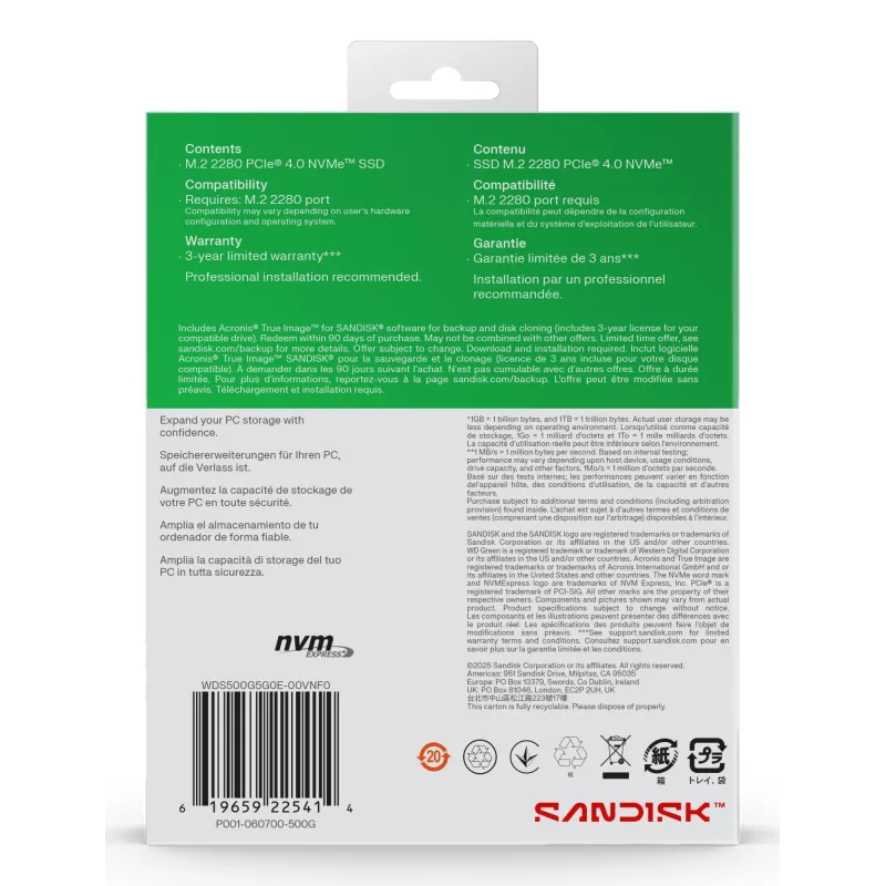 SSD series Green , POWERED BY SANDISK , 500 GB , M.2 , PCI Express 4.0 , NVMe Yes , Component for PC/Notebook/Game console , M.2 SSD size 2280 (22 x 80 mm) , Access time 0.5 ms , Mean time between failures (MTBF) 1.75 h , 150xTBW rating , Weight 5.4 g , Operating temperature (T-T) 0 - 80 °C