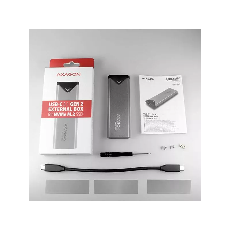- USB-C 10GBPS EXTERNAL BOX FOR M.2 SSD, USB-C USB-C CABLE 20 CM LONG, 3 THERMAL CONDUCTIVE PADS, MOUNTING KIT AND SCREWDRIVER