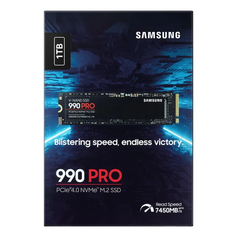 - SAMSUNG 990 PRO. SSD CAPACITY: 1 TB, SSD FORM FACTOR: M.2, READ SPEED: 7450 MB/S, WRITE SPEED: 6900 MB/S, COMPONENT FOR: PC/GAME CONSOLE