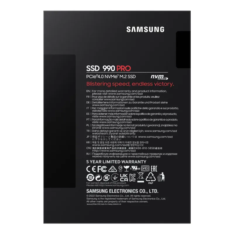 SSD series 990 PRO , 1000 GB , M.2 , PCI Express 4.0 , NVMe Yes , 2.0 , Component for PC/Game console , M.2 SSD size 2280 (22 x 80 mm) , Write speed 6900 MB/s , Read speed 7450 MB/s , Mean time between failures (MTBF) 1500000 h , Weight 9 g , Operating temperature (T-T) 0 - 70 °C