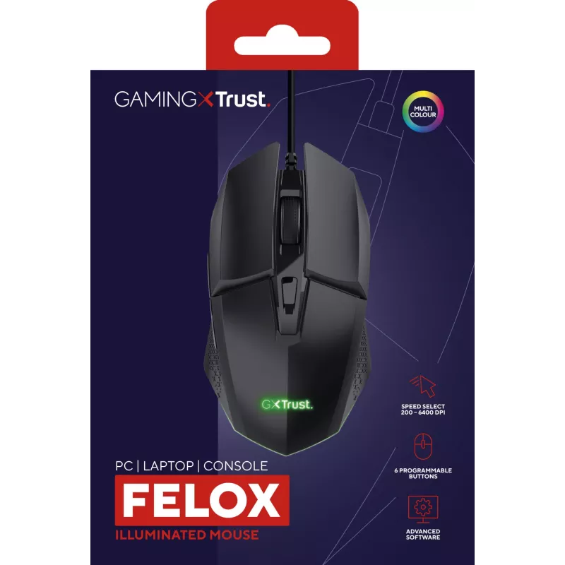 - TRUST GXT 109 FELOX. FORM FACTOR: RIGHT-HAND. MOVEMENT DETECTION TECHNOLOGY: OPTICAL, DEVICE INTERFACE: USB TYPE-A, MOVEMENT RESOLUTION: 6400 DPI, BUTTONS TYPE: PRESSED BUTTONS, BUTTONS QUANTITY: 6, SCROLL TYPE: WHEEL, ACCELERATION (MAX): 20 G. ILLUMINATI
