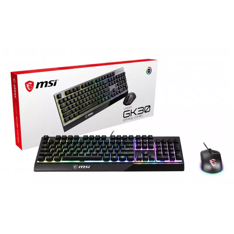 - MSI VIGOR GK30 COMBO RGB MEMCHANICAL GAMING KEYBOARD + CLUTCH GM11 GAMING MOUSE ' UK LAYOUT, 6-ZONE RGB LIGHTING KEYBOARD, DUAL-ZONE RGB LIGHTING MOUSE, 5000 DPI OPTICAL SENSOR, RGB MYSTIC LIGHT'. KEYBOARD FORM FACTOR: FULL-SIZE (100%). KEYBOARD STYLE: ST