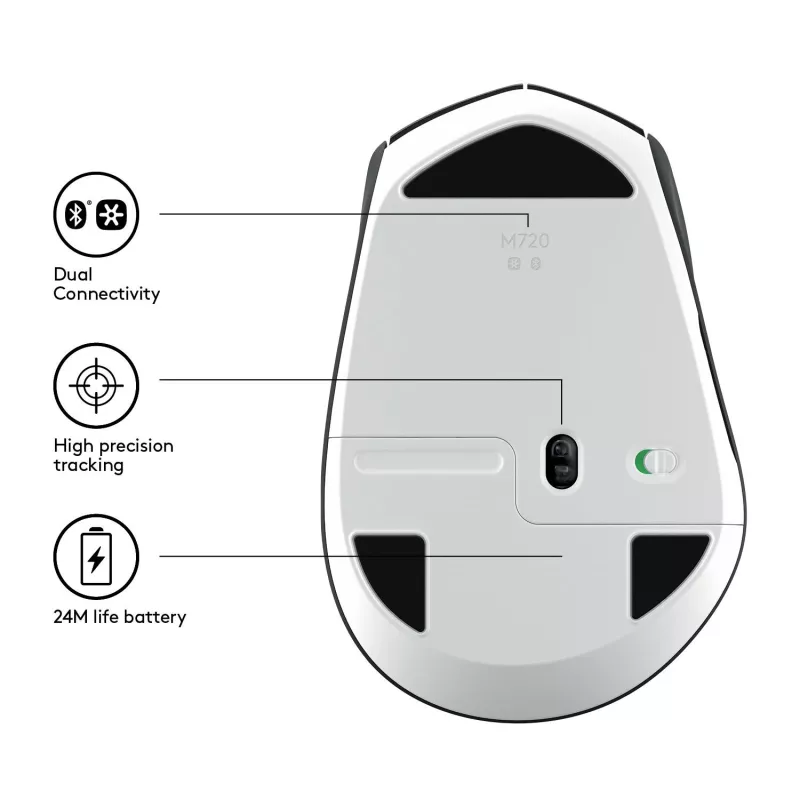 - LOGITECH M720 TRIATHLON MOUSE. FORM FACTOR: RIGHT-HAND. MOVEMENT DETECTION TECHNOLOGY: OPTICAL, DEVICE INTERFACE: RF WIRELESS + BLUETOOTH, MOVEMENT RESOLUTION: 1000 DPI, BUTTONS TYPE: PRESSED BUTTONS, BUTTONS QUANTITY: 8, SCROLL TYPE: WHEEL. POWER SOURCE:
